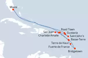Itinerario : Miami, Charlotte Amalie, Terre de Haut, Bridgetown, Fort-de-France, Basse-Terre (Guadalupe), San Juan, Road Town, Saint John's, Gustavia, Road Bay, Miami