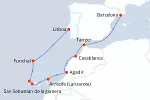 Itinerario : Barcelona, Tánger, Casablanca, Agadir, Arrecife (Lanzarote), San Sebastian de la gomera, Santa Cruz de la Palma, Funchal, Lisboa