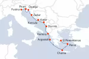 Itinerario : El Pireo Atenas, Paros, Chania, Argostoli, Kerkira, Durrës, Kotor, Korcula, Zadar, Opatija, Piran, Fusina