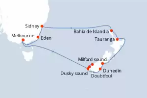 Itinerario : Sidney, Eden, Melbourne, Dusky sound, Milford sound, Doubtfoul, Dunedin, Timaru, Tauranga, Bahía de Islandia, Sidney, Hobart, Sidney