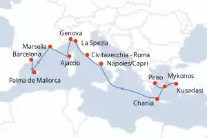 Itinerario : Barcelona, Palma de Mallorca, Marsella, Ajaccio, Genova, La Spezia, Civitavecchia - Roma, Napoles/Capri, Chania, Kusadasi, Mykonos, Pireo