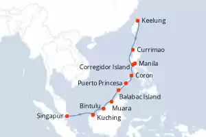 Itinerario : Keelung, Currimao, Corregidor Island, Manila, Coron, Puerto Princesa, Balabac Island, Muara, Bintulu, Kuching, Singapur