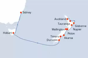 Itinerario : Sidney, Hobart, Dunedin, Timaru, Akaroa, Picton, Wellington, Napier, Gisborne, Tauranga, Auckland