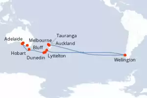 Itinerario : Auckland, Tauranga, Wellington, Lyttelton, Dunedin, Bluff, Hobart, Adelaide, Isla del Canguro, Melbourne