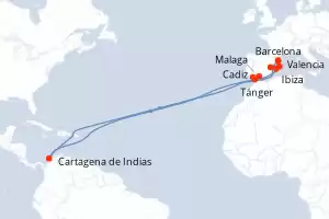 Itinerario : Barcelona, Ibiza, Palma de Mallorca, Cadiz, Tánger, Malaga, Cartagena de Indias, Valencia, Barcelona