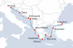 Itinerario : Estambul, Bozcaada, Mykonos, El Pireo Atenas, Githion, Katakolon, Igoumenitsa, Kotor, Dubrovnik, Zadar, Venecia