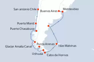 Itinerario : San antonio Chile, Puerto Montt, Puerto Chacabuco, Glaciar Amalia Canal, Punta Arenas, Ushuaia, Cabo de Hornos, Islas Malvinas, Puerto Madryn, Montevideo, Buenos Aires