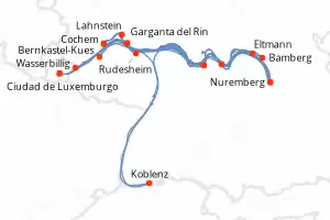 Itinerario : Luxembourg City, Nuremberg, Bernkastel-Kues, Bamberg, Würzburg, Cochem, Koblenz, Wertheim, Rhine Gorge, Rudesheim, Wertheim, Rhine Gorge, Lahnstein, Cochem, Würzburg, Eltmann, Wasserbillig, Nuremberg, Luxembourg City