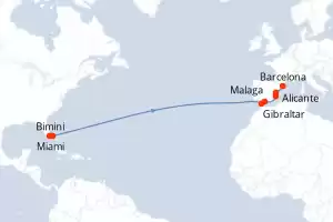 Itinerario : Miami, Bimini, Gibraltar, Malaga, Alicante, Valencia, Barcelona