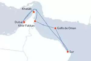 Itinerario : Dubai, Khor Fakkan, Sur, Golfo de Oman, Khasab, Dubai, Al Fujairah, Abu Dhabi, Dubai, Bahrein, Doha, Dubai